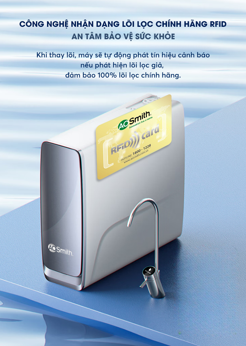 Hệ thống nhận dạng lõi lọc chính hãng bằng tần số vô tuyến RFID được đưa vào từng lõi lọc. Khi thay lõi, máy sẽ tự động phát tín hiệu cảnh báo nếu phát hiện lõi lọc giả, đảm bảo 100% lõi lọc chính hãng.