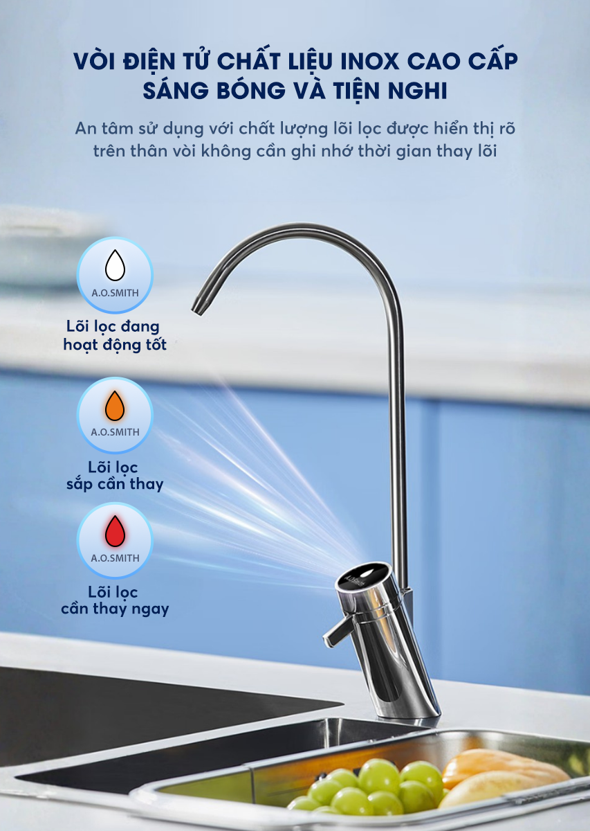 – Vòi điện tử chất liệu inox sáng bóng và tiện nghi, tích hợp hệ thống cảnh báo thay lõi ngay trên thân vòi